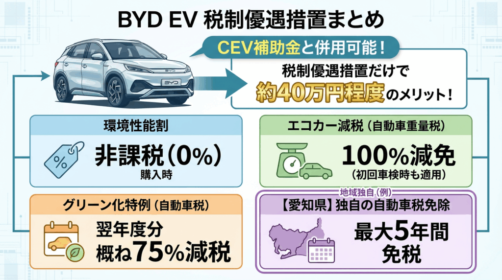 BYDのEVは、CEV補助金と合わせて以下の税制優遇措置の対象となります。これにより、約40万円程度の優遇措置を受けることが可能となります。