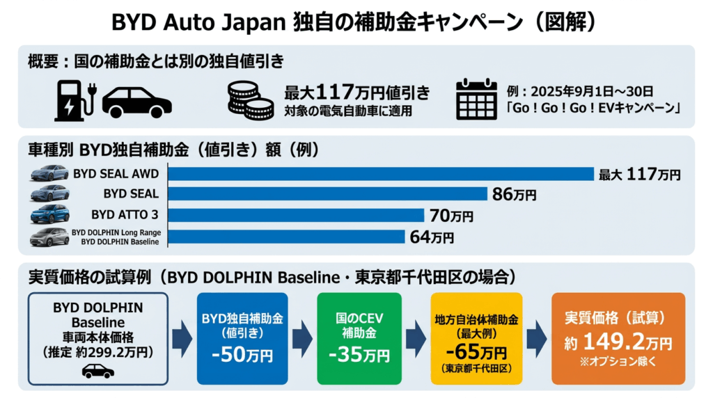 BYD Auto Japanは、国のCEV補助金とは別に、独自のキャンペーンとして「BYD補助金」(値引き)を実施することがあります。例えば、日本法人創業3周年を記念した『Go!Go!Go!EVキャンペーン』(2025年9月1日~9月30日)では、対象となる電気自動車に対して50万円から最大117万円までの補助(値引き)が提供されました。