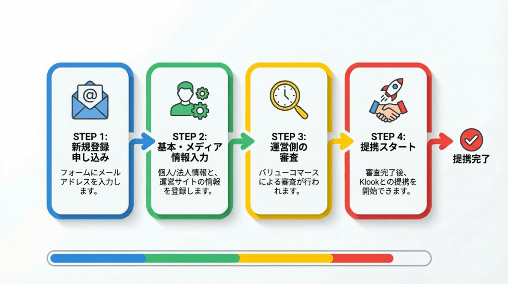 バリューコマースに登録してKlookの案件と提携するまでのステップは以下の通りです