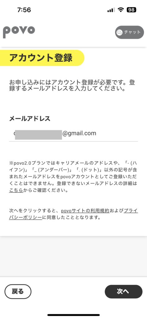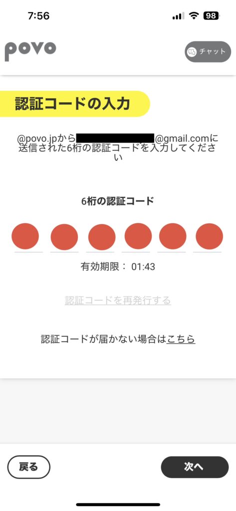 メールアドレスを入力し、届いた6桁の認証コードを入力します。