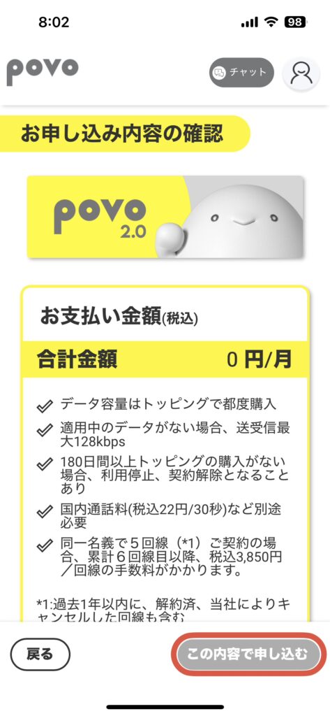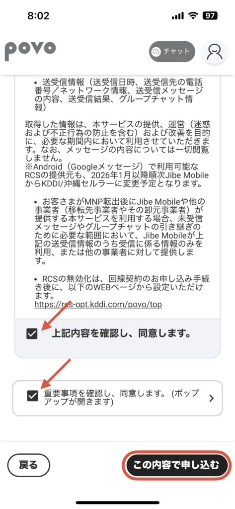 内容を確認し、「この内容で申し込む」をタップ。利用規約と契約に関する確認事項にチェックを入れて、再度「この内容で申し込む」をタップします。