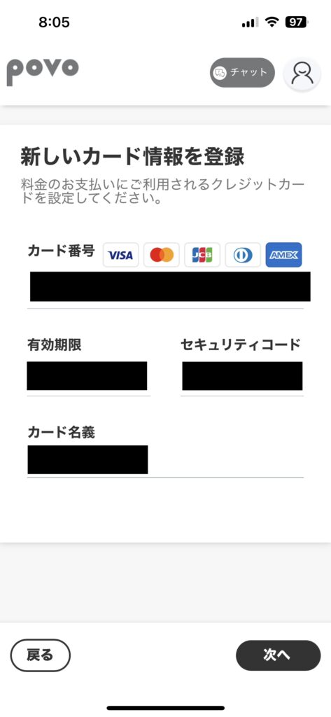 クレジットカード情報(カード番号・有効期限・セキュリティコード・カード名義)を入力します。
